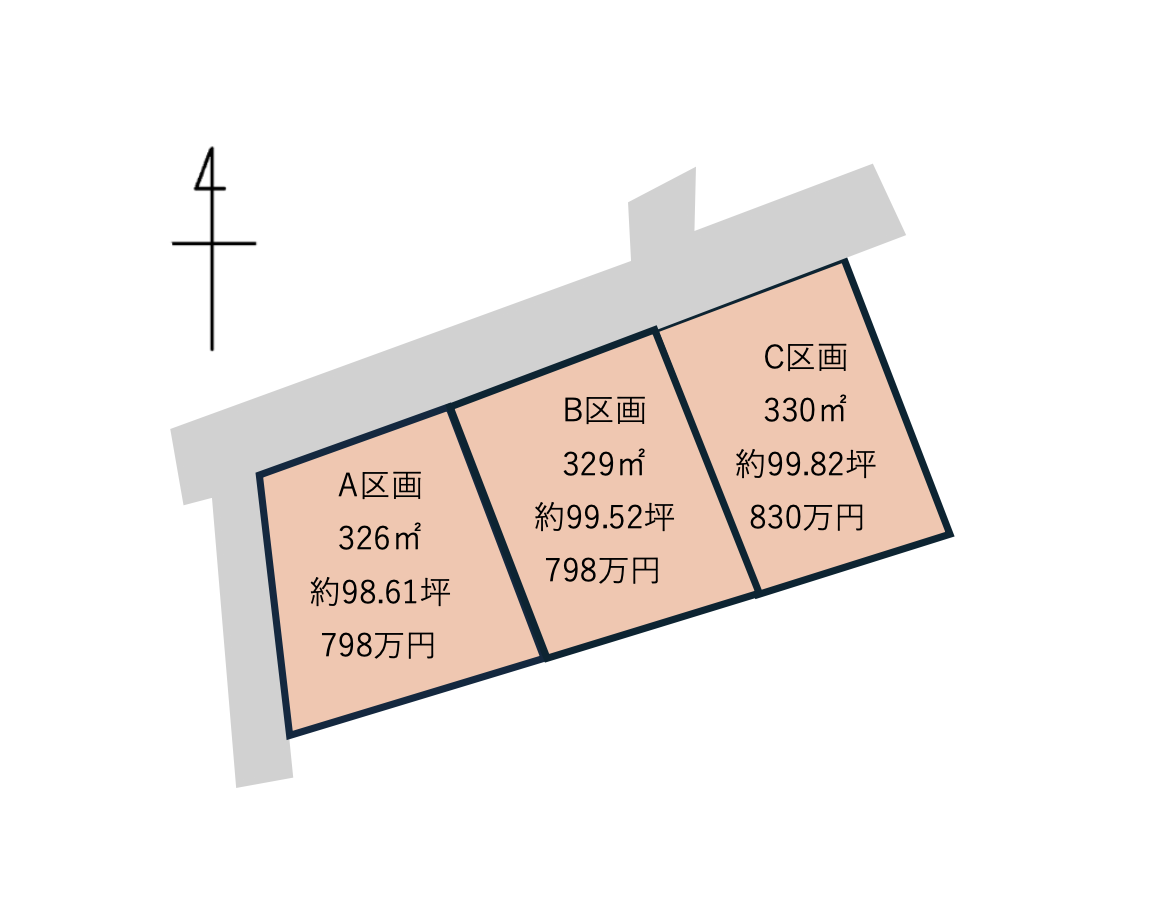 | 土地 | 登記簿 | 326㎡(98.61坪)〜 330㎡(99.82坪) | 地目 | 田 | 接続状況 | 公道 | |